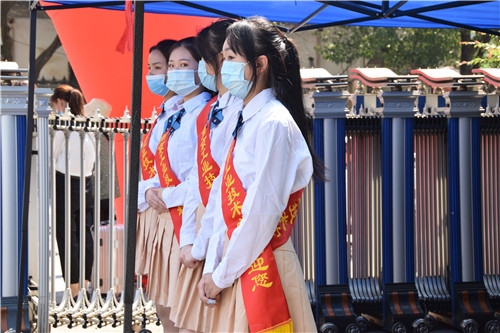 学生志愿者分站校门两侧